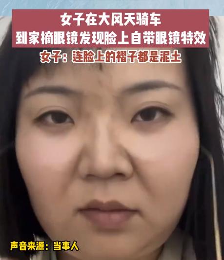 18)4月10日,北京一女子在大风天骑车,到家摘眼镜发现脸上自带眼镜特效。当事人谢女士介绍:“除了眼镜遮到的地方,其他地方都是土,就连褶子里头都是泥。”