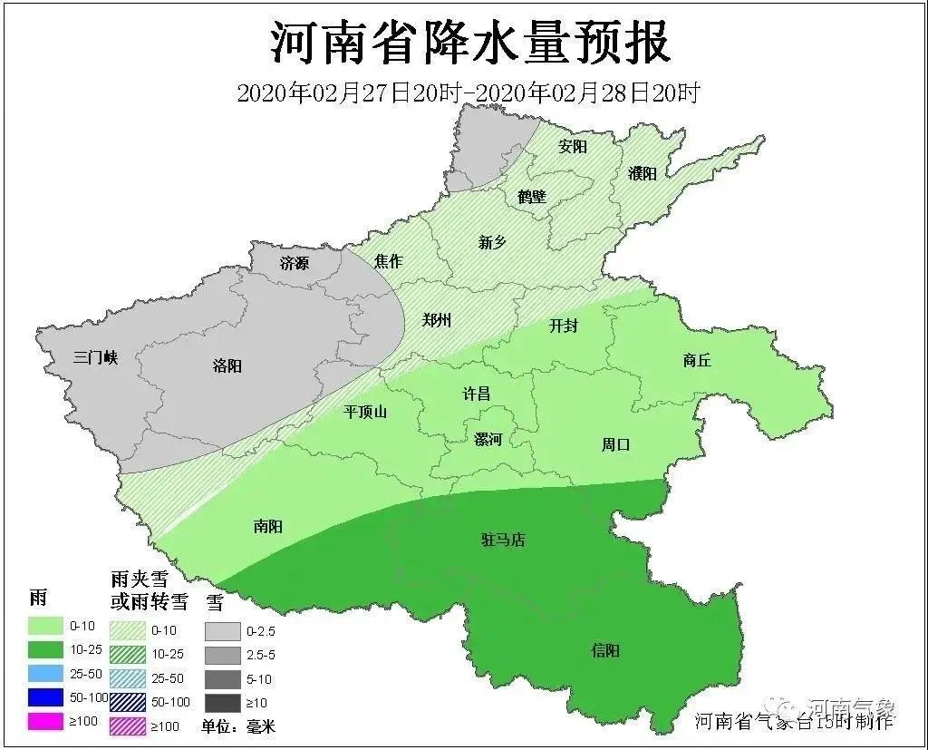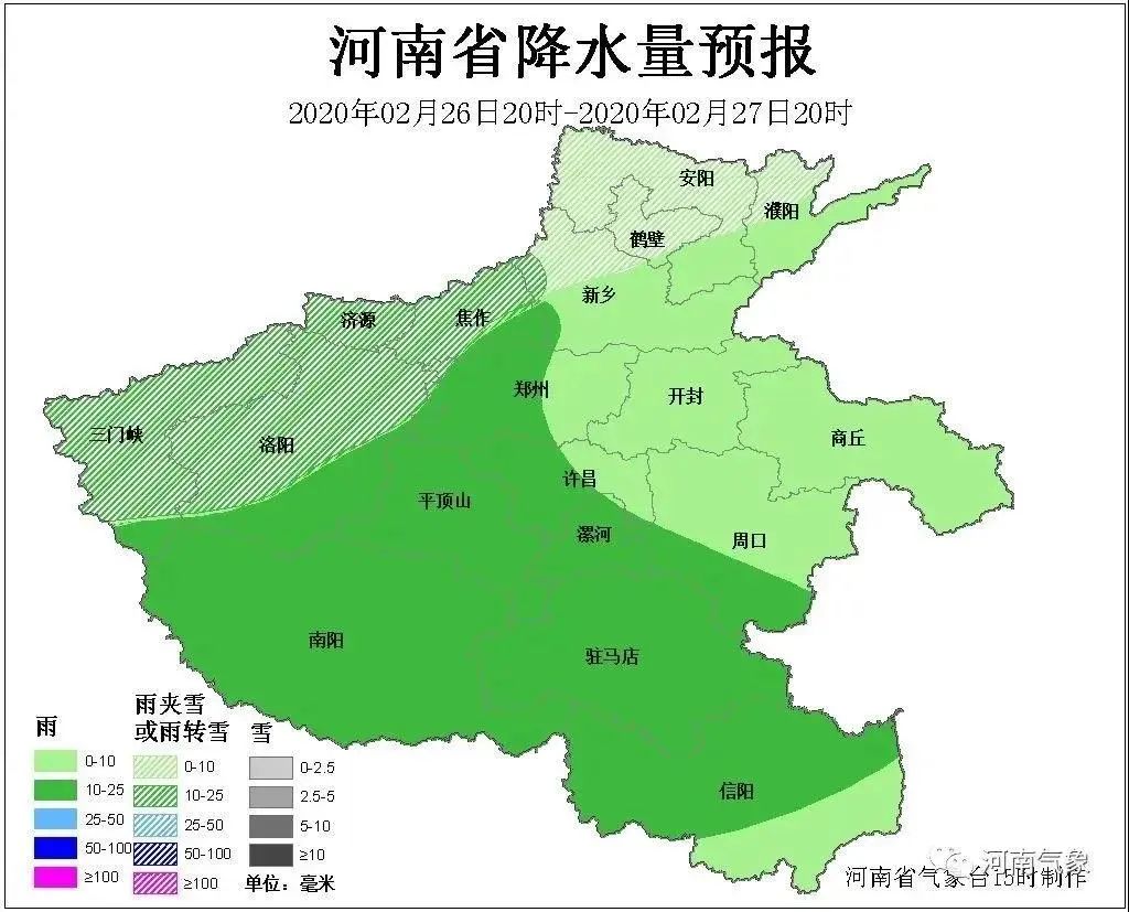 根据河南省气象台分析,2月26日至28日全省有一次明显降水及降温天气过程,26日夜里,全省大部分地区有小雨,其中西部、西南部部分地区有中雨。27日,西部、北部小到中雨转雨夹雪;其他地区有中雨,其中南部部分地区有大雨。受冷空气影响,26日至27日全省东北风4级左右,阵风6级,26日起气温明显下降,27日和28日是本轮降温的最低点,全省最高气温累积降幅达8℃-12℃。