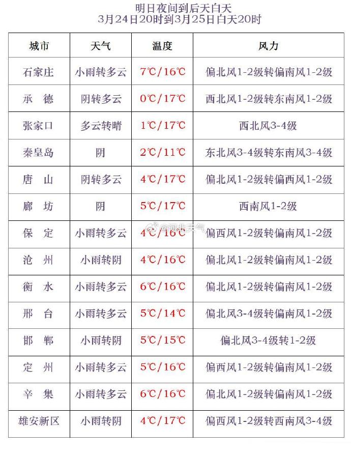 明天夜间到25日,全省阴转多云,保定、廊坊及以南地区有小雨,其中邢台南部、邯郸局地有中雨。