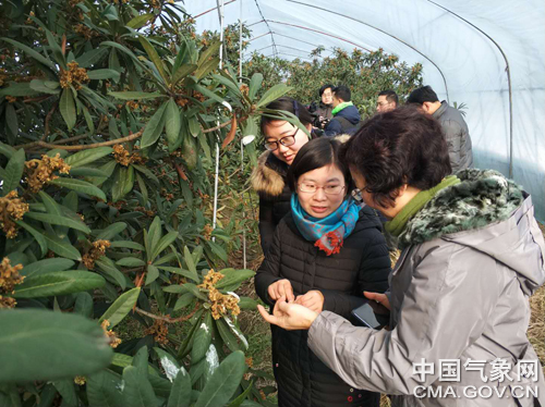 设施农业气象服务人员和南京市农委园艺技术推广站技术人员在横溪镇种植基地调查水果生长情况。孙啸 摄影