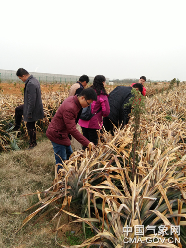 中国气象报通讯员杨健 刘武报道 2月6日,广西壮族自治区来宾市气象局组织农业气象专家,深入红河红现代特色农业核心示范区调查果树受冻害情况见。受低温冷冻天气影响,示范区内的果树受到了不同程度的冻害。对此,农气专家向果树管护人员提出指导意见。为做好霜冻天气服务,来宾市气象局及时通过手机短信、气象预警大喇叭、微信、微博等渠道,加强霜冻预报预警信息发布,并派出农气专家实地指导,帮助农户做好农作物防寒保暖工作。