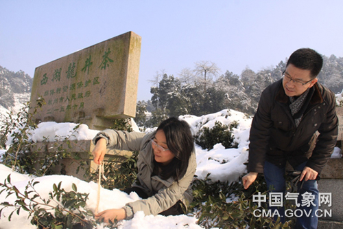 经现场实测发现,目前龙井群体种越冬腋芽尚处于休眠期,在厚雪覆盖中生存良好,到目前为止本次连续雨雪冰冻天气对西湖龙井茶区基本没有伤害发生。这次低温冰雪还有利于杀灭虫卵,同时冰雪融化对增加土壤墒情也有一定的积极作用。