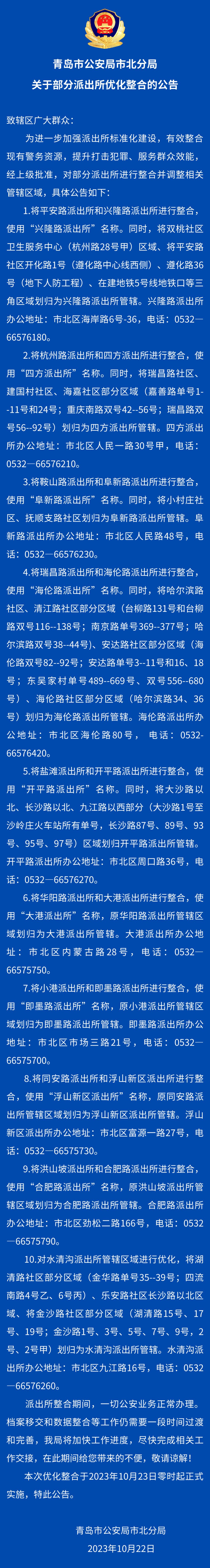 关于部分派出所优化整合的公告