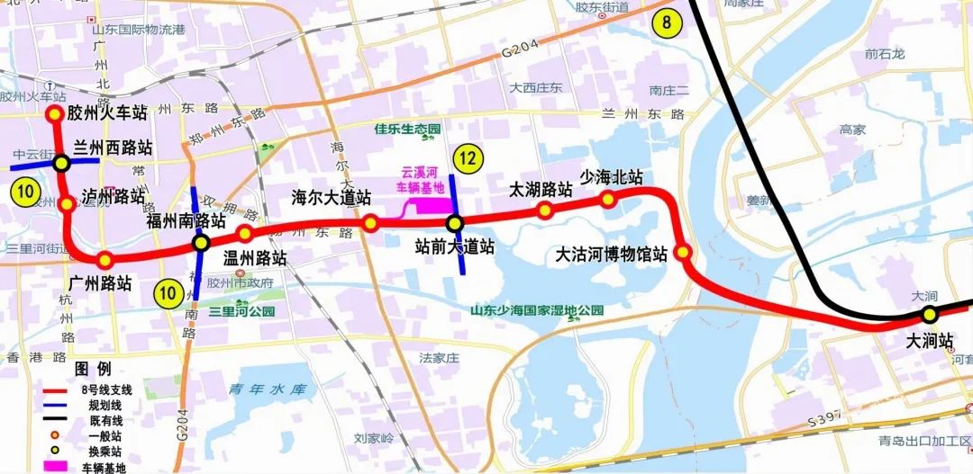 地铁8号线支线东起8号线大涧站,至胶州火车站。线路途经城阳区和胶州市,线路全长20.4km,均为地下线。全线共设车站12座(其中大涧站为改造工程),均采用明挖法施工;共12个区间,正线区间隧道主要采用盾构法施工,局部采用暗挖法及明挖法施工。