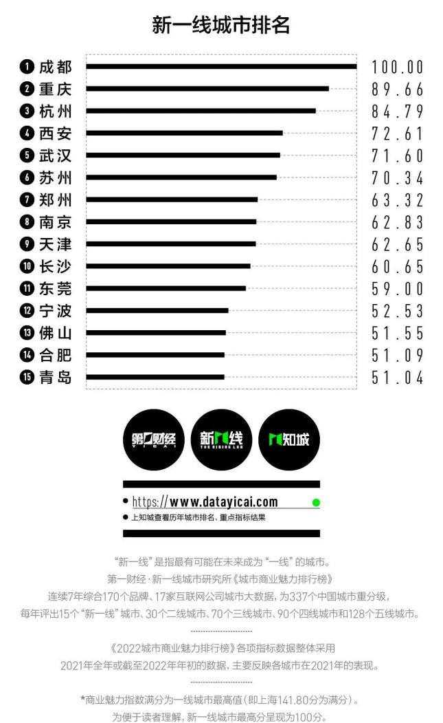 新一线城市中,成都已连续十年位居榜首,重庆反超杭州居第二名,沈阳跌出,合肥重返新一线。