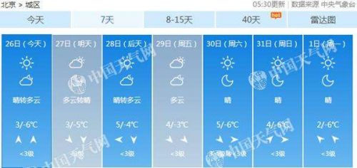 预计今天(26日)北京气温有所下降,最高气温将仅有3℃,夜间有轻雾,公众出行请注意防范。27-29日,大气扩散条件转差,能见度将有所降低,敏感人群请注意关注空气质量的变化,提前防范。此外,目前进入流感高发期,老人和儿童应特别注意防范,注意防寒保暖,尽量避免前往人多的地方。