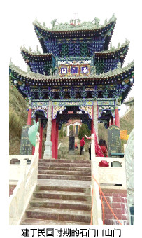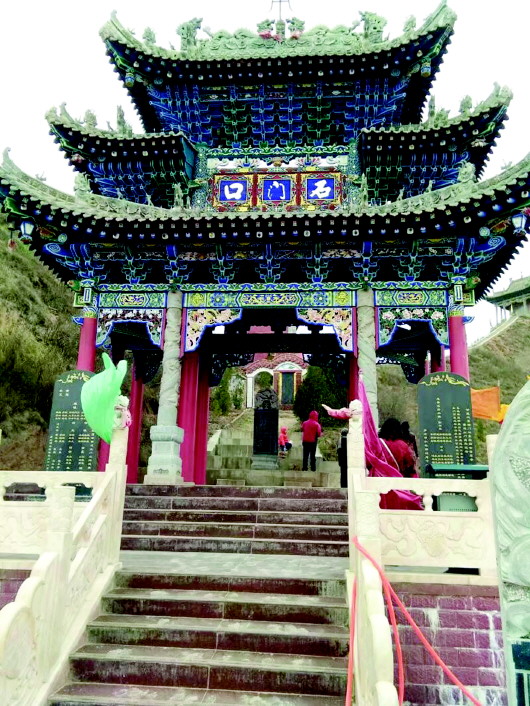拾级而上,是一座飞檐拱斗的三层建筑,中层门楣之上也题有“石门口”三字。这就是始建于同治七年,后来战乱被毁,后人重新修建的石门口山门。民国十年所撰碑文记载:“为了追记东岳圣庙之渊源,承前启后,现将原载东岳圣庙功成告峻始录,重新勒碑刻铭以示后人。”同治七年,巩昌府、陇西县、伏羌县、宁远县,一府三县正堂捐奉银重建了石门口东岳庙宇。由此而知,远在同治年间,石庙就寄托着周围几县老百姓祈盼风调雨顺、五谷丰登、安康乐业的朴素愿望。沿山路继续前行,山势渐陡,细路蜿蜒直上,至龙王庙。陇中黄土高原西南边缘,气候干旱,先民们每逢风雨失调,久旱不雨,或久雨不止时,都要到龙王庙祈愿,以求龙王治水,洒甘露于田禾。当然,这只是一种美好的愿望,今天当你站在龙王庙前,你所看到的是古建筑的雄伟奇秀的,和祖先雕塑艺术的奇妙,你所感受到的是历史文化的厚重。