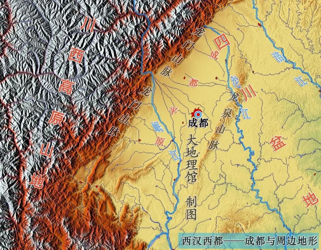 成都,居四川盆地西部,西、北两面大山,东有龙泉山脉,中间一块水系纵横的平原——成都平原,成为四川盆地的之中的一个富饶的小盆地——这样优越的地理条件,奠定了它长盛不衰的基础。