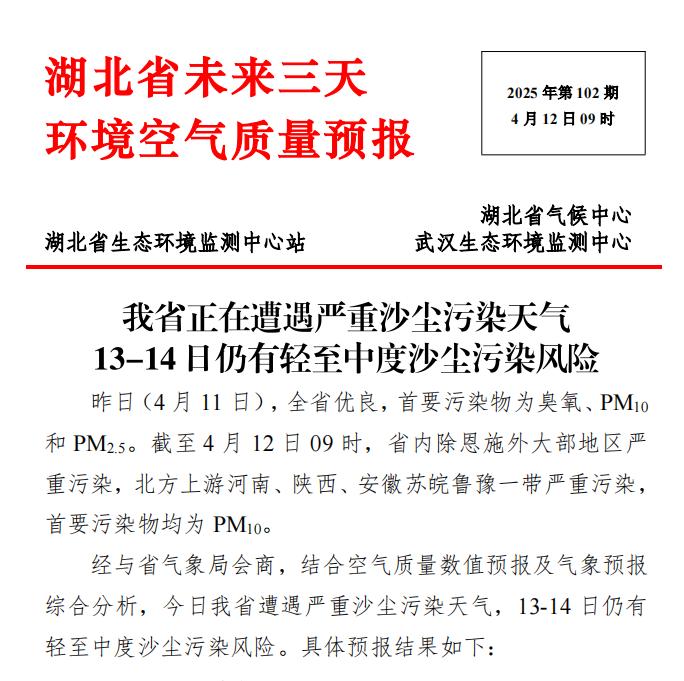 预报称,截至4月12日9时,省内除恩施外大部地区严重污染,北方上游河南、陕西、安徽苏皖鲁豫一带严重污染首要污染物均为 PM10。