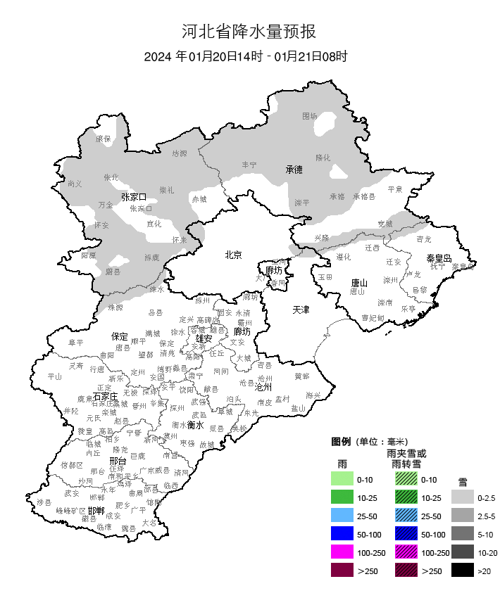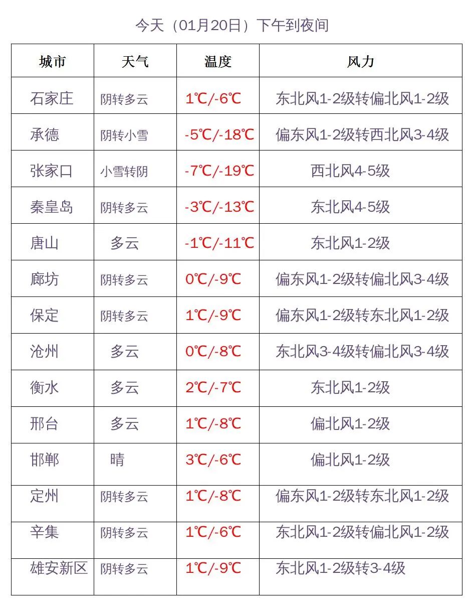 今天下午到夜间,张家口、承德、唐山北部、秦皇岛北部、保定西北部阴有小雪或零星小雪,其他地区阴转多云。
