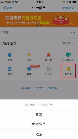 步骤二:进入页面后,点击“暖气费”后,可选择“我家”或是“新增分组”