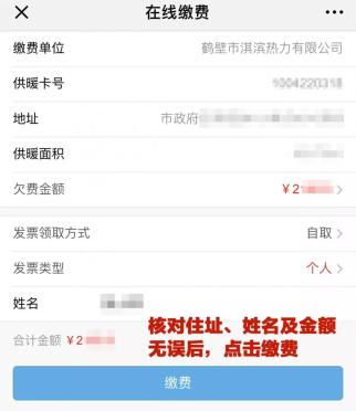 步骤六:核对住址、姓名及金额后点击缴费,并选择立即支付即可缴费成功。(咨询电话:6898110)