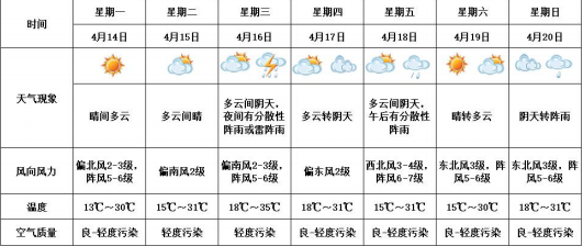 气温:本周气温稳步回升,最高气温维持在 30℃以上,其中 16 日将升至 34~35℃。森林火险气象风险等级较高,请注意防范。