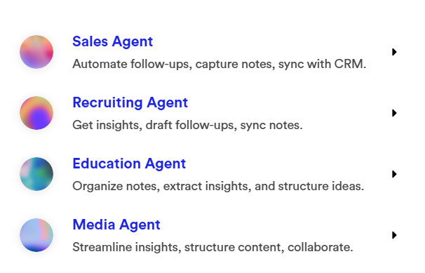Otter.ai 的核心优势在于其 AI 语音识别技术,能够实时、高精度地转换语音为文字,并在此基础上提供智能摘要、关键词提取和协作功能。目前,Otter.ai 推出了 Sales Agent、Recruiting Agent、Education Agent 和 Media Agent 四大领域智能体: