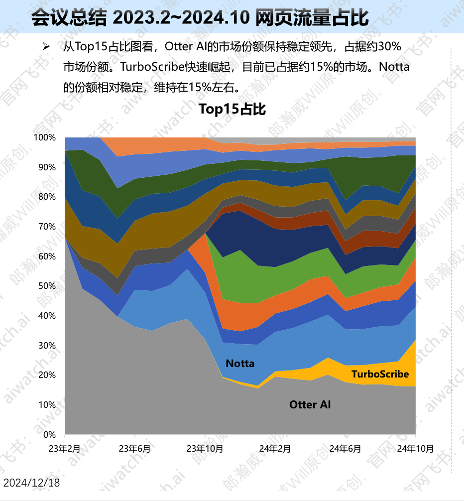 早在 2020 年疫情期间,由于与 Zoom 的深度集成推出实时转录功能,其使用量曾激增 5 倍,注册用户快速攀升。AI 产品数据统计和分析的平台AIwatch.ai 发布的产品数据榜显示,根据网页流量数据,Otter.ai 在 2023 年 2 月至 2024 年 10 月的市场份额保持稳定上升,占据约 30% 的市场份额,成绩非常亮眼。
