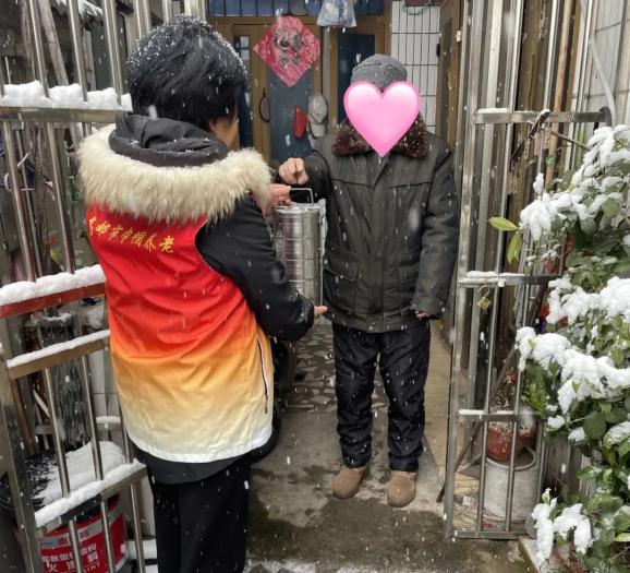 高邮市发布暴雪蓝色预警。巾帼居家养老服务中心工作人员,提前备齐蔬菜、肉类等菜品,并针对雨雪天气,准备御寒套餐,为独居、空巢等订餐老人准时准点送上暖心可口饭菜。