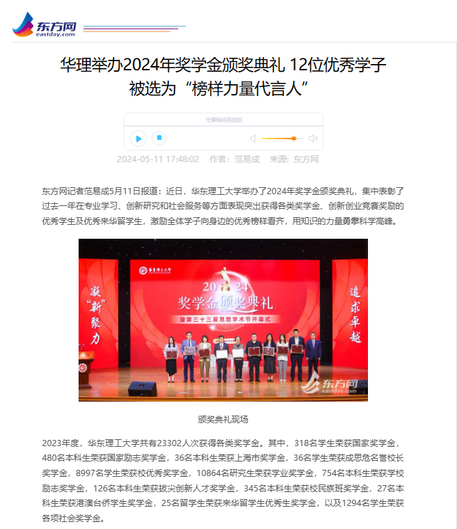 【东方网】华理举办2024年奖学金颁奖典礼 12位优秀学子被选为“榜样力量代言人”