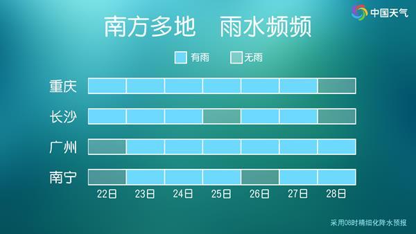 最近两天,南方降雨明显发展增强,局地雨量破纪录。预计,今天(4月22日)至28日,江南、华南等地阴雨天气较多,部分城市或雨水全勤,降雨有利于缓和广西、广东等地旱情,但部分地区累计降雨量较大,需谨防旱涝急转,并防范强对流天气的不利影响。