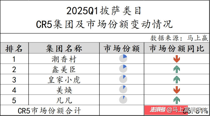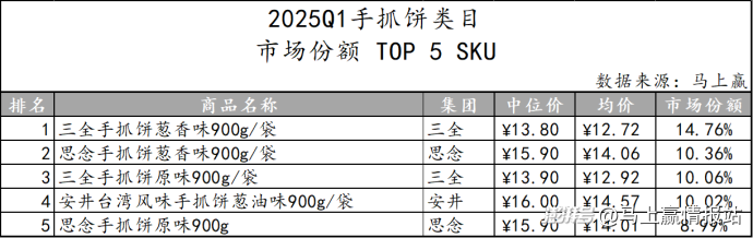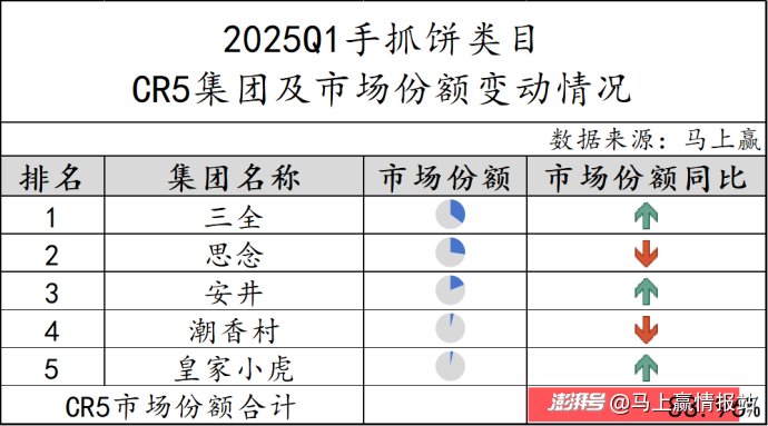 2025年Q1手抓饼类目市场集中度颇高,CR5集团市场份额合计达88.96%。由此可见,三全、思念、安井、潮香村与皇家小虎占据了绝大部分市场,留给其他集团的空间极为有限。此外,三全、安井和皇家小虎市场份额同比上升,思念与潮香村同比下滑,市场格局或正处于动态演变当中。