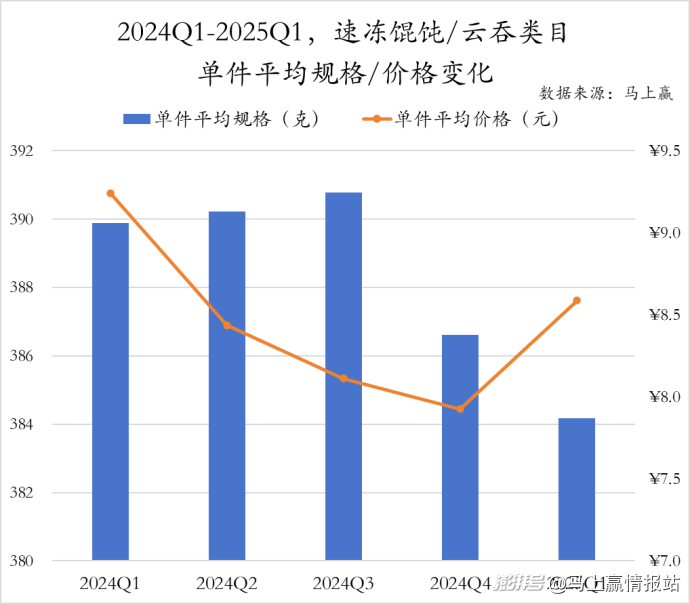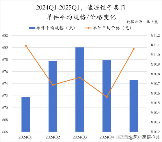 2024Q1至2025Q1,速冻饺子类目的件均规格和件均价都在一定区间内波动,并表现出较为明显的季节性变化。速冻饺子类目的件均规格在670-680克区间波动,且2025年Q1同比有所增加。而件均价在2024年Q2至2024年Q4的变化趋势与件均规格一致,体现出量升价降的高性价比策略,而当节庆过后则恢复规格与价格。