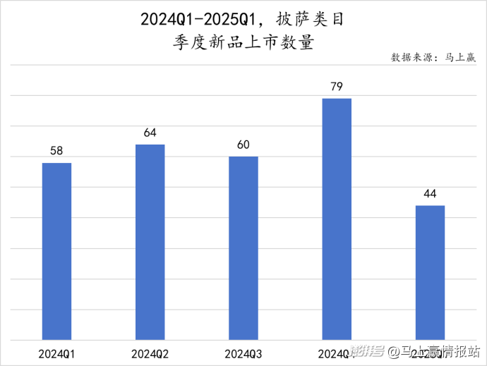 作为仍在发展阶段的品类,披萨市场的新品数量处在较低水平,近五个季度均未突破80款。值得关注的是,2025年Q1新品上市数量呈现明显下滑趋势,环比上一季度减少35款,同比2024年Q1也有14款的缩减,仅有44款新品上市。