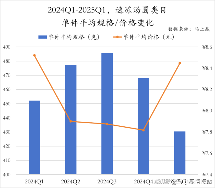 通过件平均规格/价格变化进行观察,2024年Q1至2025年Q1,速冻汤圆的件均规格呈现先增后减的变化趋势,当然可能与Q1中包含春节,节庆消费习惯与平日的产品消费习惯不同相关。与件均规格的变动走势相反,速冻汤圆类目的件均价呈现先减后增的态势,Q1的件均价格最高,或也与春节节庆消费相关。