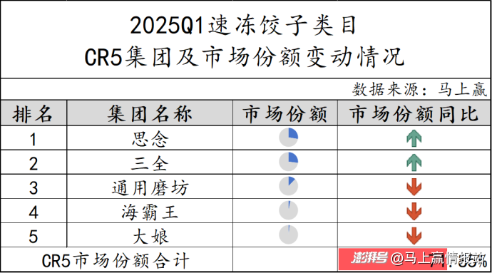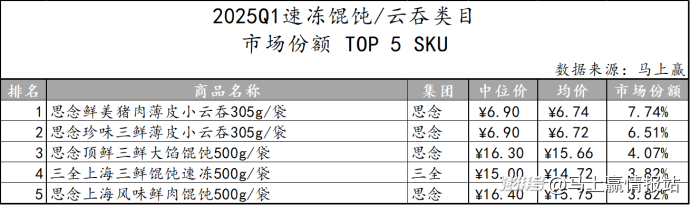 在刚刚过去的2025年Q1,速冻饺子类目市场份额TOP 5 SKU仍由三全、思念两家产品占据。三全旗下的灌汤水饺更是在与思念旗下同类商品的价格、规格均相近的情况下,占据高达10.79%的市场份额。而思念集团则以多种口味、规格和价格的产品占据三个席位,可见思念在产品布局方面的显著优势。