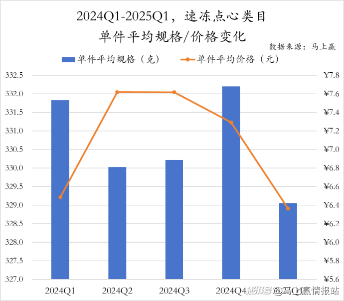 相较于速冻食品其他类目,速冻点心的件均规格较小,2024年Q4规格最大,也仅有332克左右,尽管在2024年Q2和2025年Q1有所减少,但整体稳定在329-332克区间内。相反,速冻点心类目的件均价格则变化较大,在2024年Q2增加近1.2元后连续下跌,显示出行业较为激烈的价格竞争,或是新兴品牌低价策略冲击市场所致。