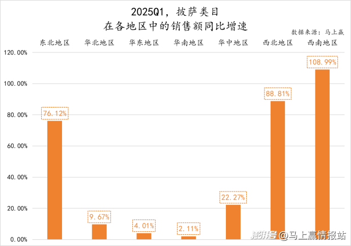 尽管披萨类目所占市场份额和销售额整体规模都不大,但在各地区中的销售额同比增速都优于其他类目,所有地区销售额同比增速均为正。但具体来看,区域差异十分显著,西南地区以108.99%的同比增速爆发式增长,东北地区和西北地区也紧随其后,华中地区以22.27%的同比增速稳健增长,而华北、华东和西南地区则相对滞后。