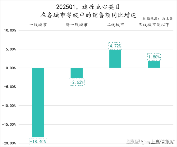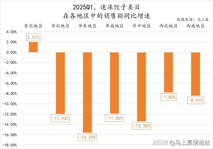 分地区来看,2025 年Q1速冻点心类目销售额同比增速呈现出明显差异,不同于其他类目的整体下跌,速冻点心类目在多个地区呈现上升态势,其中西南地区一马当先,销售额同比增速高达 11.20%,东北地区表现也较为突出,华北、华东地区增速相对和缓。而华南、华中和西北地区则呈现负增长态势,其中华南和西北地区下跌较为严重。