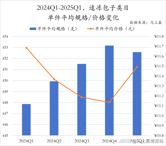 从件均规格和件均价变化来看,速冻包子类目在2024年整年呈现出规格稳增、价格缓降的特点,或与类目本身的增长承压与以价换量的策略相关,类目的件均规格从448克提升至453克,价格从11.7元逐步下滑至11.1元。而刚刚过去的2025年Q1则出现较大变化,在均规格稍有减少的情况下,件均价有较大幅度提高,可能与企业调整产品组合以及春节节庆因素有一定相关性。
