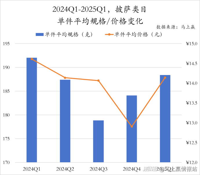 2024年Q1至2025年Q1期间,披萨类目的件均规格和件均价都呈现出先减后增的趋势。件规格从2024年Q1的192克连续缩减至170克后,到2025年Q1回升到185克以上。披萨类目件均价则在2024年整年呈现下降态势,到2025年Q1同样有所回升,但整体来看,除2024年Q4的价格低谷外,其余季度在14.5元左右窄幅波动。