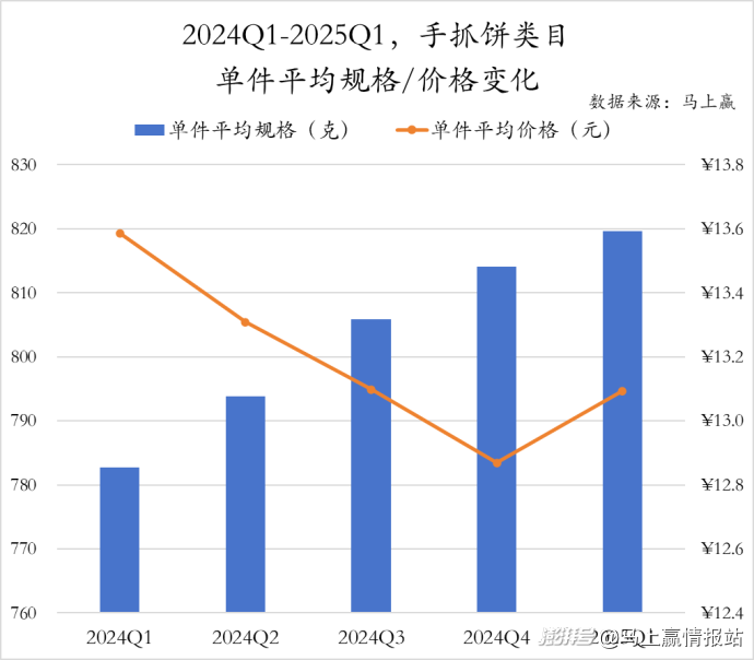 2024年Q1至2025年Q1,手抓饼类目的产品件均规格稳步递增,2025年Q1达到约820克,同比增加近40克。反观件均价,2024年Q1处于较高水平,此后价格持续走低,直至2025年Q1出现一定程度的回升,但整体来看价格波动幅度相对较小,最高与最低价差值不超0.8元。
