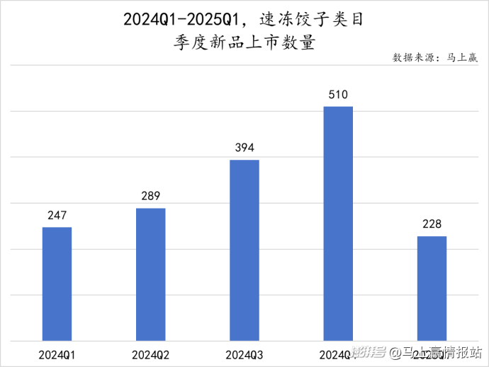 作为速冻食品市场份额占比第二的类目,速冻饺子市场的活跃程度较高,在过去五个季度中新品推出数量均在200款以上。从变化上来看,速冻饺子类目新品推出数量呈现出季节性变化,2024年Q4以510款新品遥遥领先。而2025年Q1速冻饺子行业新品上市数量降至228款,创下近五个季度新低,环比2024年Q4大幅减少55.3%。