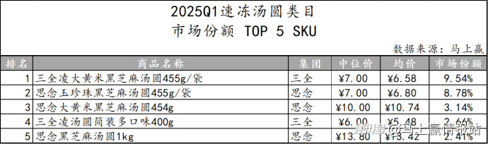 2025年Q1的速冻汤圆类目市场份额TOP 5 SKU仍由三全和思念两大巨头包揽。其中,三全的"凌大黄米黑芝麻汤圆"以9.54%的市场份额占据榜首,另一款简装多口味产品排名第四。思念旗下产品布局则更为多元,以不同价格和规格/口味的产品覆盖不同消费场景。