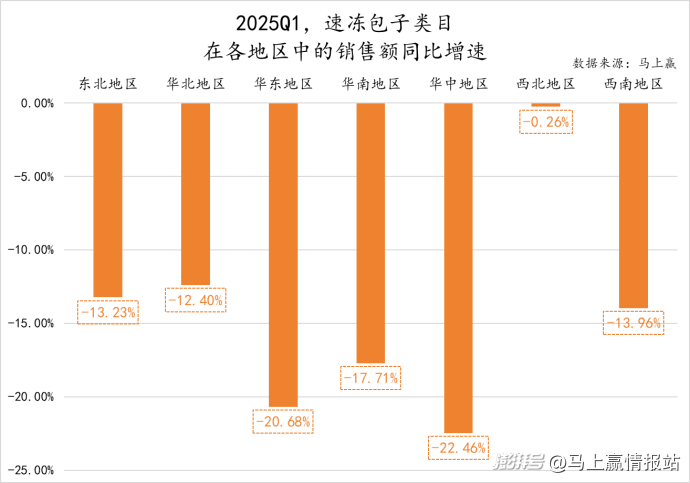 2025年Q1,速冻包子类目销售额在全国各地区均呈现下滑态势,其中西北地区表现相对较好,仅有0.26%的下跌,而其余六个地区的下滑程度均超过10%,华东地区和华中地区销售额同比下跌更是高达20.68%和22.46%。当前消费者更倾向于选择新鲜的短保产品,便利店的即食早餐选择增多也分流了传统速冻包子需求,速冻包子市场或需要通过产品升级等方式来应对当前问题。