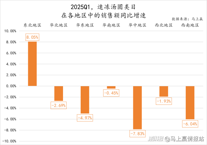 按照地区划分来看,2025年Q1速冻汤圆类目销售额同比表现差异显著,仅东北地区呈现出8.05%的增长态势,其余华北、华东、华南、华中、西北、西南六大地区,均出现不同程度的销售额同比下滑,其中华中地区下跌7.83%、西南地区下跌幅度达6.04% ,下滑较为明显。