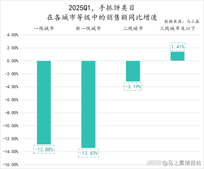 从城市等级来看,手抓饼类目销售额增速差异同样明显,三线城市及以下市场实现了1.41%的同比增速,反观高线城市则表现疲软,一线城市、新一线城市和二线城市均有所下滑,新一线城市甚至以13.43%的跌幅超过一线城市。