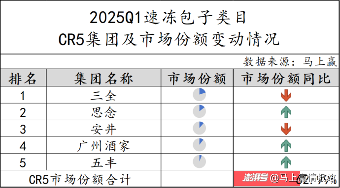 2025年Q1速冻包子市场中,CR5集团市场份额合计62.99%,并且依然是由三全和思念领跑,其中三全凭借更显著的市场份额优势占据主导地位,安井、广州酒家和五丰紧随其后,但与速冻汤圆、速冻饺子类目不同,速冻包子类目中,三全和思念的市场份额领先幅度并没有与其后的集团拉开断层式的差距。