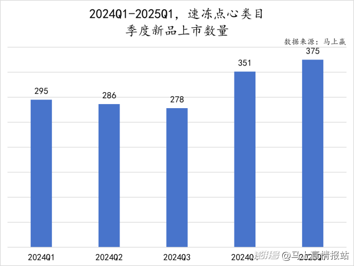 速冻点心的新品上市数量也较为可观,从趋势上看,自2024年Q4突破300款以来再次增长,2025年Q1更是以375款新品数量超出去年同期80款,同比增长幅度大,在其市场份额小于速冻馄饨/云吞的背景下,其新品数量远高于速冻馄饨/云吞,展现出了类目的活力。