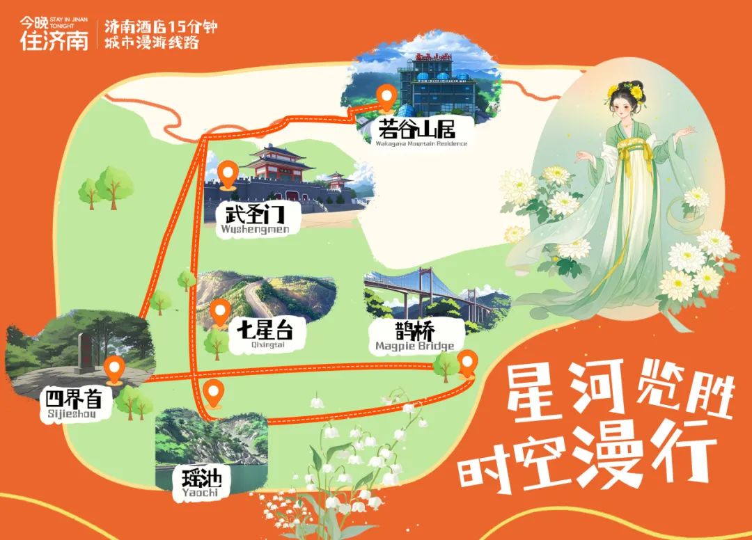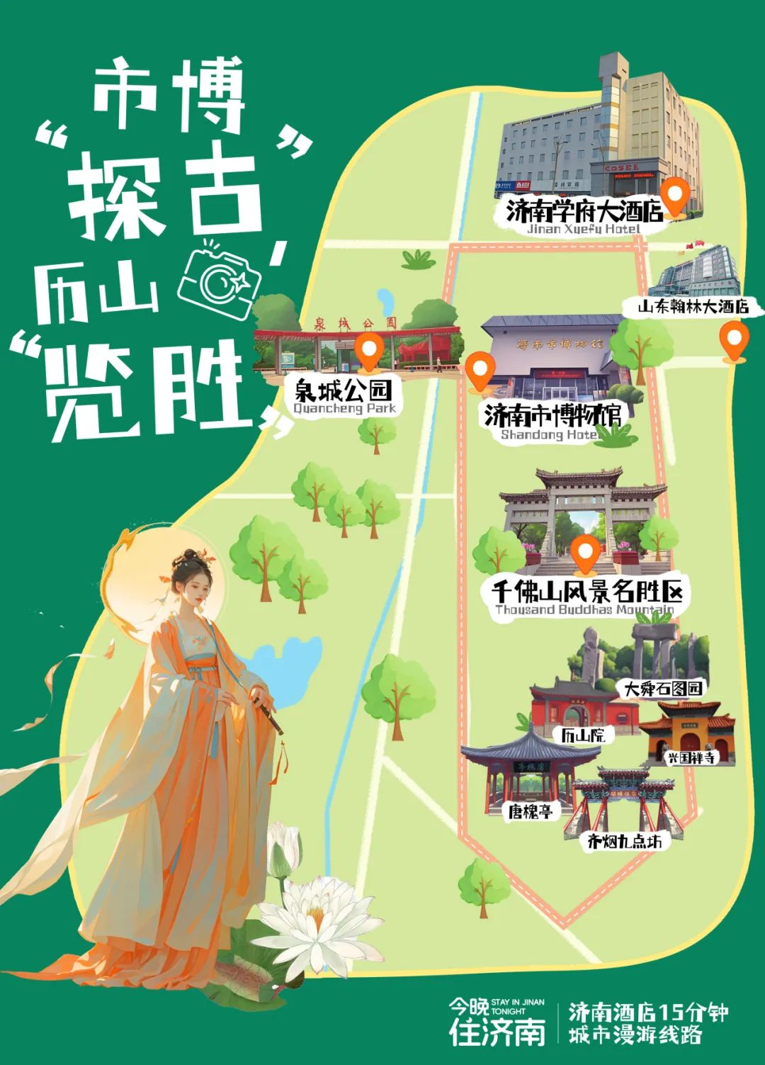 线路点位:济南学府大酒店→泉城公园→济南市博物馆→千佛山风景区(大舜石图园、历山院、齐烟九点坊、唐槐亭)→济南学府大酒店