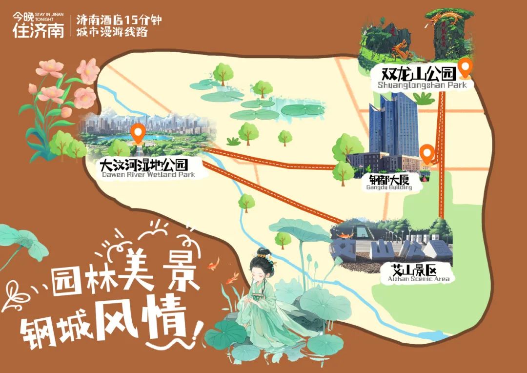 从酒店出发,开启在市北探寻自然与人文之美的悠闲之旅。小清河景观带,城之灵动水脉,河堤漫步,邂逅宁静灵动。济南动物园,动物们的温馨家园,您可在这里与动物们亲密互动。标山,“齐烟九点”之一,历史厚重感犹存,登高俯瞰,高楼市井交织,济南独特风貌尽显。凤凰山,“齐烟九点”之一,城中绿色高地,远离尘嚣,尽享自然宁静。泺口长途汽车站,城市交通枢纽,周边商业繁华。
