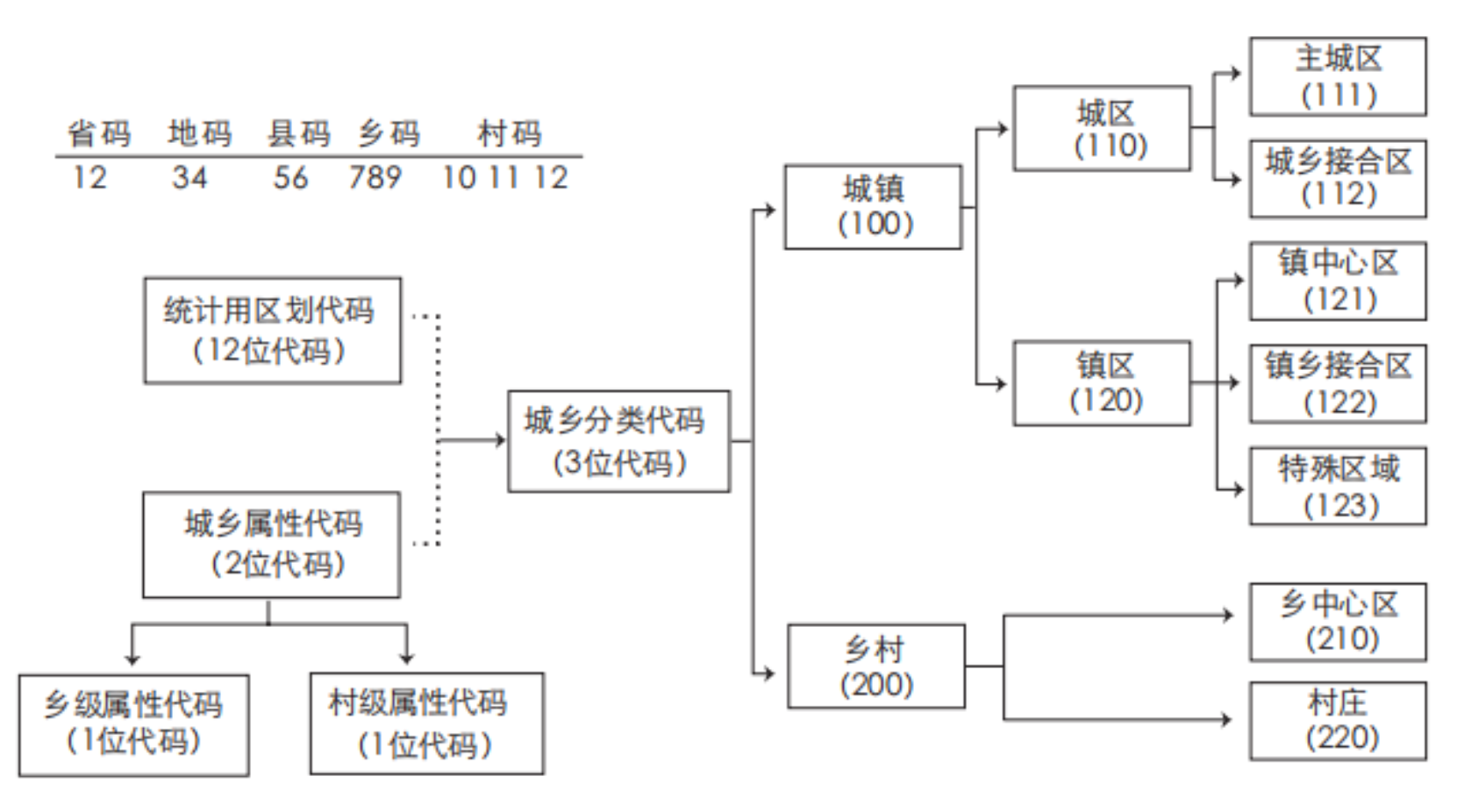 城乡划分工作主要包括编制统计用区划代码(第1—12位)、城乡属性代码(第13—14位),以及转换生成城乡分类代码(第15—17位)三部分,如图2所示: