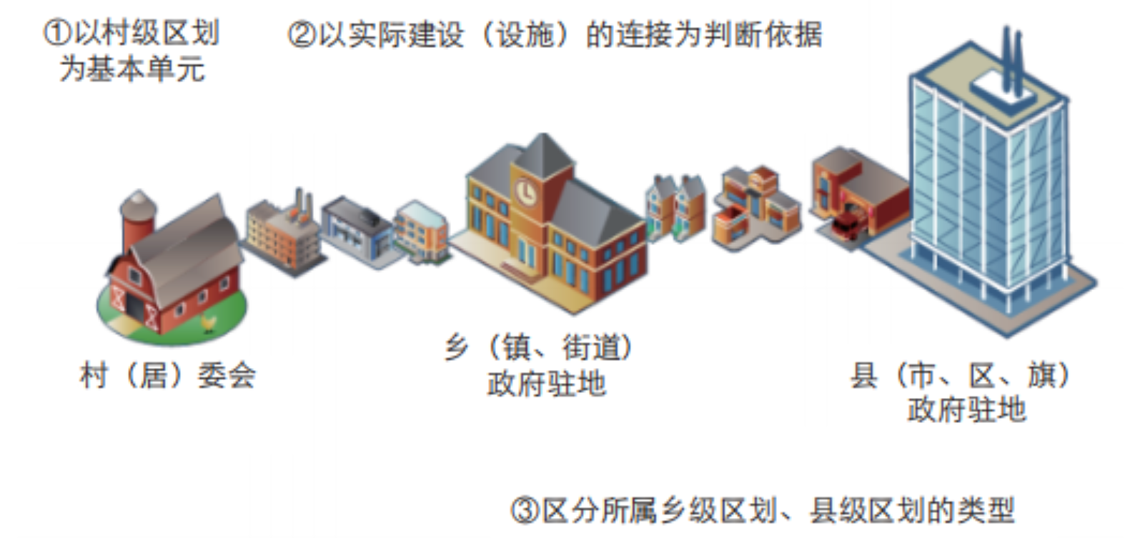 因此,城乡划分工作以村(居)委会等村级单位为划分对象,通过判断村(居)委会驻地、乡(镇、街道)政府驻地、县(市、区、旗)政府驻地之间的实际建设连接情况,将我国的地域划分为城镇和乡村。如图1所示: