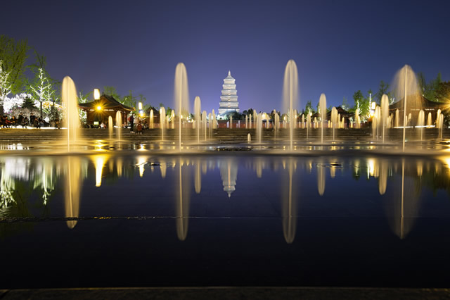 始建于公元589年的大雁塔是西安的标志性建筑之一,其脚下的大雁塔广场是亚洲唐主题文化广场,已经成为西安百姓宜赏宜聚、观光休闲的一处文化旅游胜景。大雁塔广场分为南北两个广场,其中北广场是欣赏西安夜景的好去处。这里有着美丽的音乐喷泉表演,夜色降临时,斑斓的灯光从大雁塔高处射向喷泉池,喷泉水柱随着动感音乐变换形状,优美动人,而大雁塔被烘托得更加庄严。喷泉每周一、周三、周四、周五每天表演4场,周六、周日及国家法定假日每天5场,周二2场,每场20分钟。 【 详细>>】
