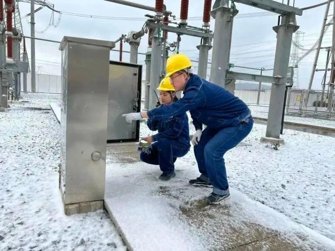 (国网陕西电力员工顶风冒雪进行设备检查工作)