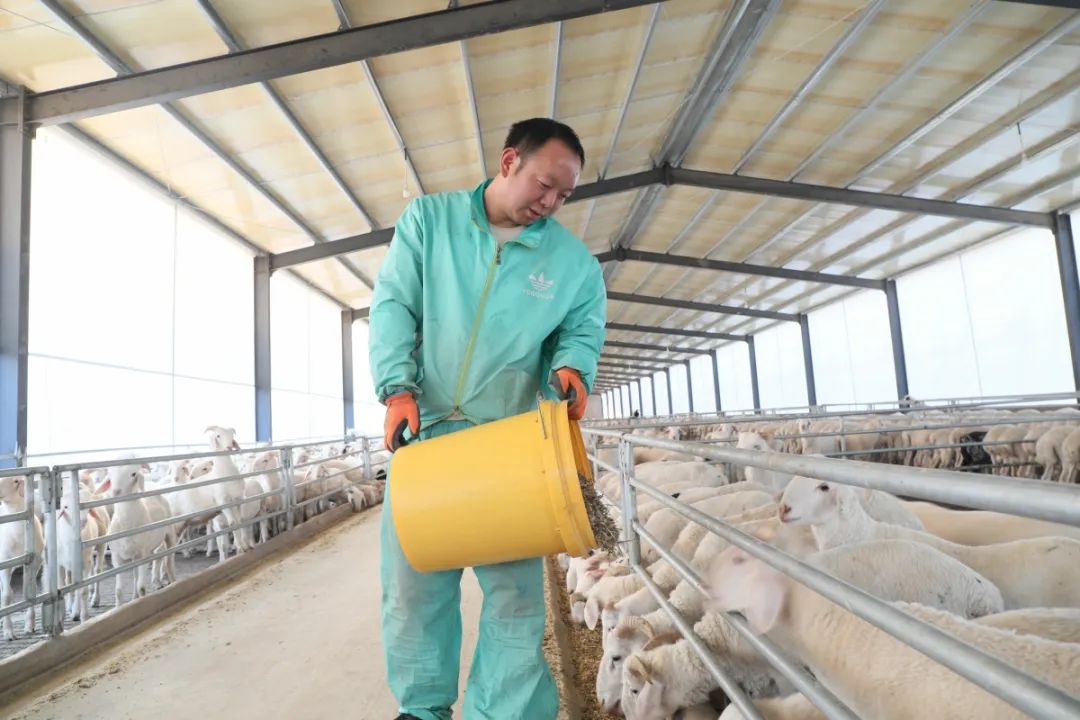 在河北奥贝斯食品有限公司投资建设的肉羊养殖基地,工人在添加饲料。孙海峰 摄