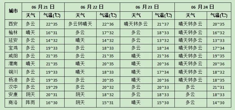 6月21日:陕北、关中多云间晴天,陕南多云。秦巴山区、商洛部分地方有小雨或阵雨。关中平原中东部最高气温可达35℃以上。