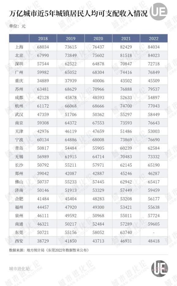 万亿城市2022年度人均收支数据于近期陆续公布。