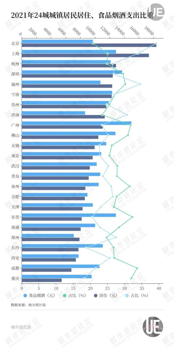 这其中不同的城市呈现出不同的消费倾向,比如北京、上海、杭州的“居住”支出居万亿城市前三位;成都的“食品烟酒”支出占比稳居万亿城市第一位等。